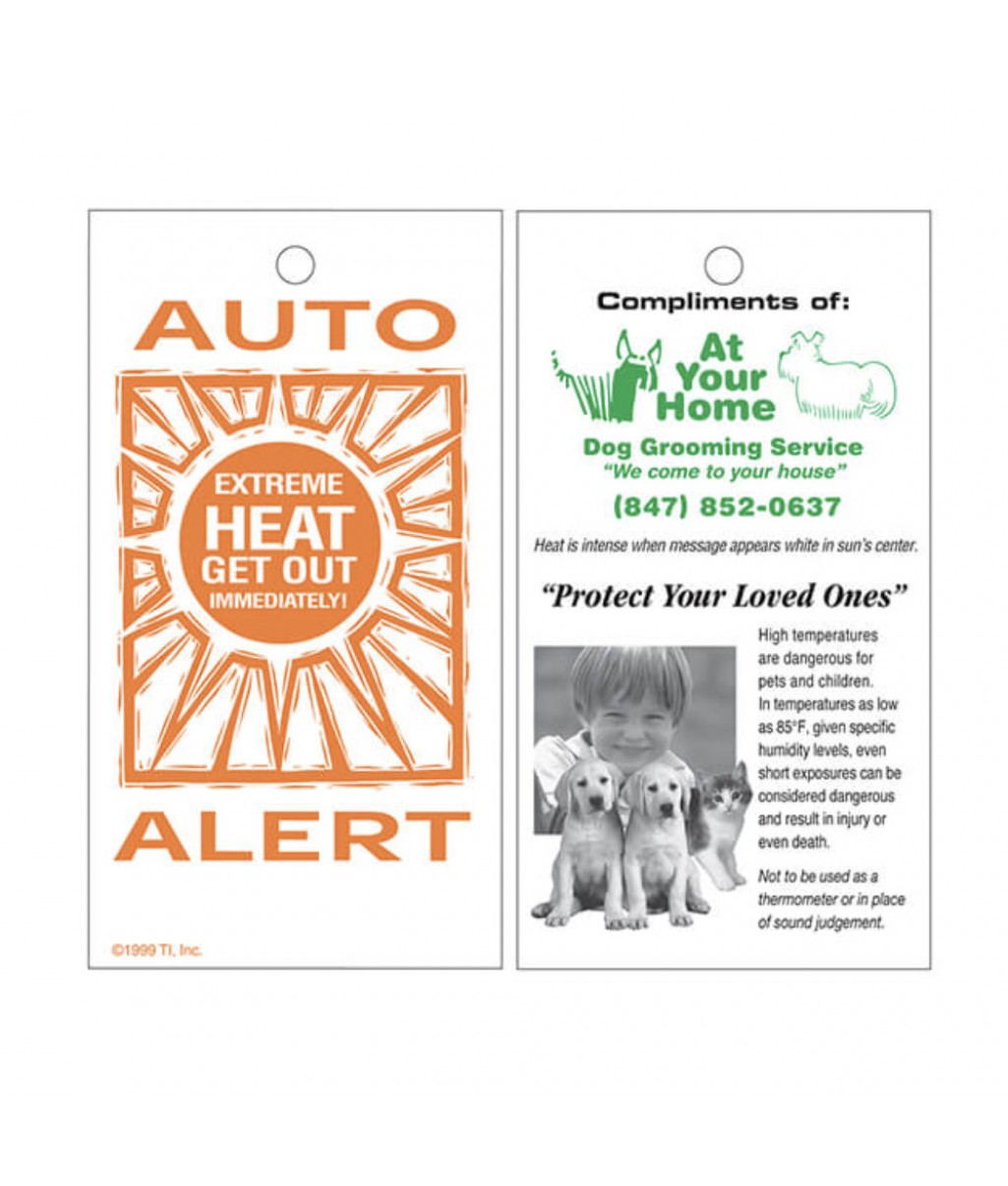 The high temperature inside parked cars can quickly become dangerous, especially for children or pets. You can help prevent this tragedy by providing customers with custom printed automatic alarm car thermometer security cards. This is a low-cost promotional product with many benefits! When the temperature inside the car begins to reach a dangerous level (approximately 87.8 ° F-31 ° C), the black thermochromic dial will disappear and display a warning message. When temps are restored to a safe level for reuse, it will turn back black. The back is printed with temperature information and customized imprints to promote your business and show everyone your level of care for customers, their pets, and children. It is conveniently hung on the rearview mirror and comes with a rubber ring strap.